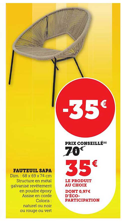 Découvrez l'offre de Fauteuil Sapa chez Bi1! Cette offre fantastique est maintenant disponible dans le nouveau catalogue de Bi1. Profitez de cette occasion et économisez considérablement sur votre achat.
