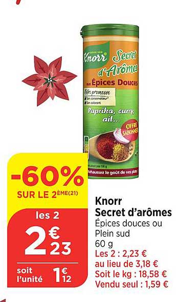 Découvrez dès maintenant la offre Knorr Secret d'arômes Épices Douces dans le catalogue de Bi1. Cette offre est valable du 04/12/2024 au 09/12/2024.