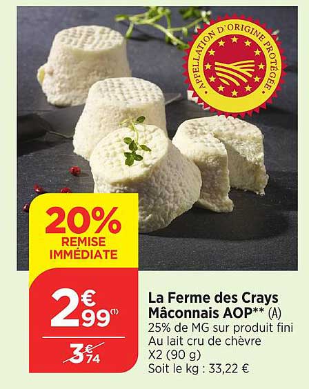Découvrez dès maintenant la offre La Ferme des Crays Mâconnais AOP** (A) dans le catalogue de Bi1. Cette offre est valable du 30/10/2024 au 04/11/2024.