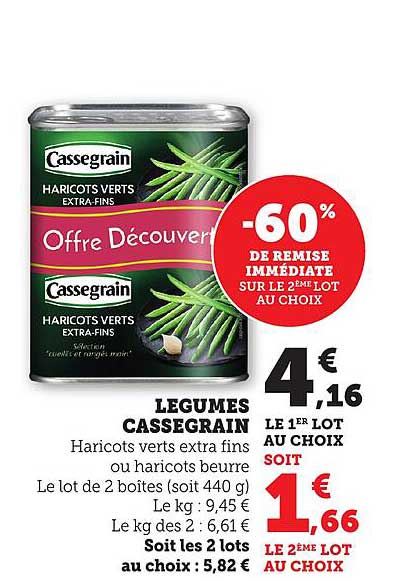 Découvrez l'offre de Legumes Cassegrain Haricots Verts Extra Fins chez Bi1! Cette offre fantastique est maintenant disponible dans le nouveau catalogue de Bi1. Profitez de cette occasion et économisez considérablement sur votre achat.