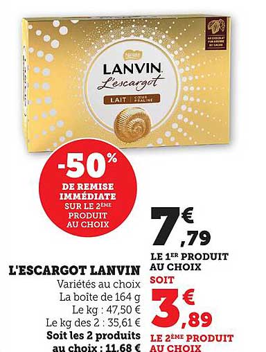 Dénichez une délicieuse offre sur les célèbres escargots LANVIN, un incontournable pour tous les gourmands ! Pendant la période du 4 au 16 novembre, profitez d'une remise exceptionnelle de 50% sur le deuxième produit au choix. Une occasion parfaite pour découvrir ou redécouvrir ces petites merveilles gustatives.
