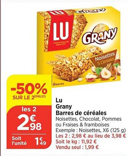 Découvrez l'offre de Lu Grany Barres De Céréales chez Bi1! Cette offre fantastique est maintenant disponible dans le nouveau catalogue de Bi1. Profitez de cette occasion et économisez considérablement sur votre achat.