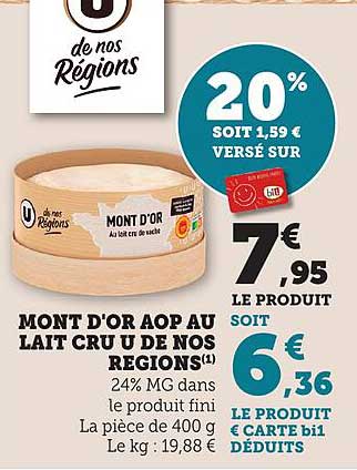 Découvrez dès maintenant la offre Mont d'Or AOP au lait cru de nos Régions dans le catalogue de Bi1. Cette offre est valable du 04/11/2025 au 16/11/2025.
