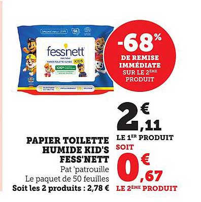 Découvrez une offre exceptionnelle sur le papier toilette humide Kid's Fess'n'Tt, idéal pour les petits! Pendant la période de promotion, vous pourrez profiter d'une réduction de -68% sur le deuxième produit. C'est une occasion à ne pas manquer pour les familles cherchant à allier praticité et douceur pour les enfants.