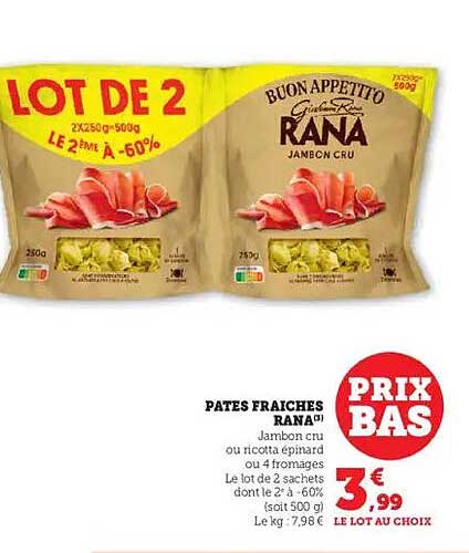 Si vous êtes à la recherche d’un repas savoureux et rapide, alors ne manquez pas cette offre exceptionnelle sur les Pâtes Fraîches Rana ! Ces délicieuses pâtes, accompagnées de jambon cru ou de ricotta épinard, vous permettront de concocter en un rien de temps un plat irrésistible pour vos dîners en famille ou entre amis. Avec une réduction de 60% sur le deuxième paquet, c'est l’occasion parfaite pour tester ces créations gourmandes.