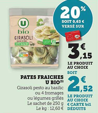 Découvrez un délice culinaire avec les pâtes fraîches U Bio, idéales pour égayer vos repas en toute simplicité. Ces girasoli, au pesto au basilic ou aux 4 fromages, sont une excellente option pour ceux qui recherchent la qualité sans compromis. Que ce soit pour un dîner entre amis ou un repas rapide en semaine, cette offre est une véritable aubaine à ne pas manquer!