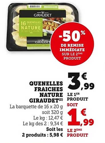 Découvrez une offre attrayante sur les quenelles fraîches nature Giraudet, un produit de haute qualité qui allie saveur et praticité. En profitant de cette promotion, vous pouvez vous offrir des plats variés et gourmands, idéaux pour vos repas en famille ou entre amis. N'attendez plus pour savourer ce délice culinaire !