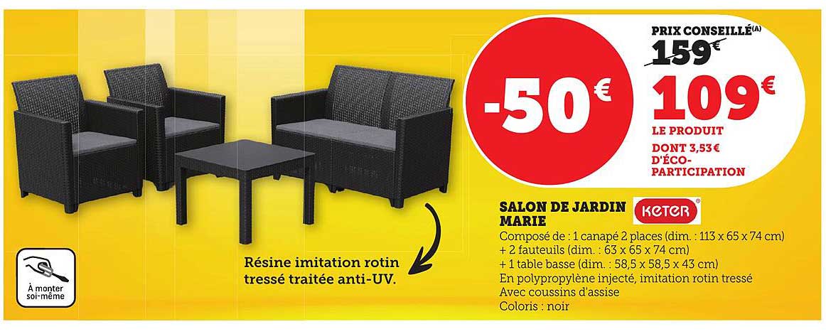 Découvrez dès maintenant la offre SALON DE JARDIN MARIE dans le catalogue de Bi1. Cette offre est valable du 05/03/2025 au 16/03/2025.