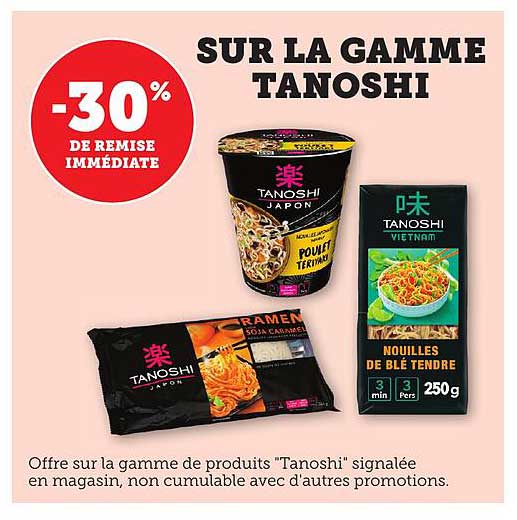 Profitez d'une remise immédiate de -30% sur la gamme Tanoshi, une sélection qui vous emmène au cœur des saveurs asiatiques. Que vous soyez en quête d'un repas rapide ou d'une idée originale pour vos soirées, ces produits allient praticité et goût. L’offre est valable du 2025-11-04 au 2025-11-16, ne manquez pas cette occasion!