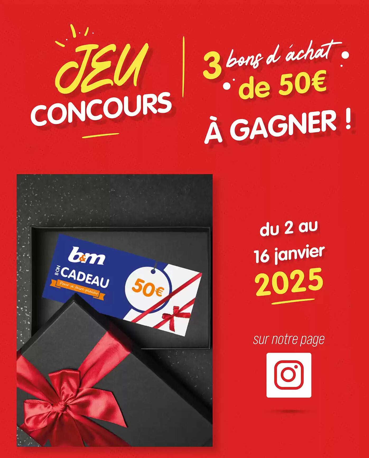 Découvrez dès maintenant la offre JEU CONCOURS | 3 bons d’achat de 50€ À GAGNER ! dans le catalogue de b&m. Cette offre est valable du 26/12/2024 au 28/01/2025.