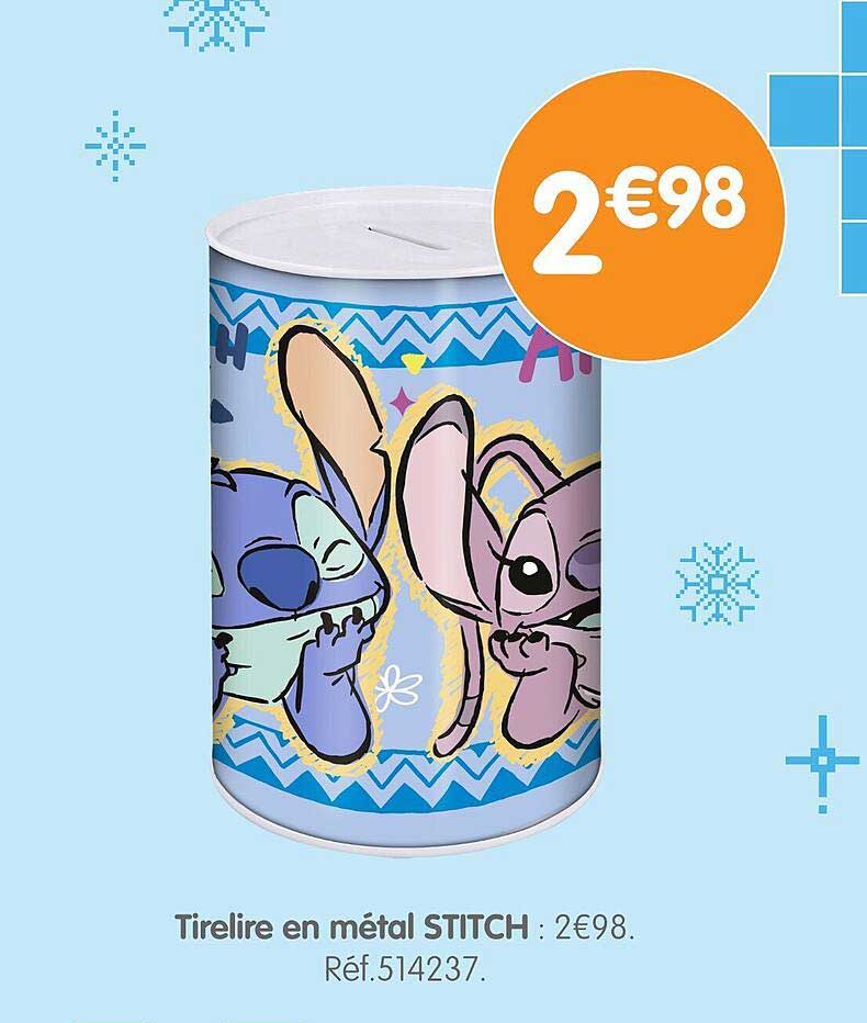 Découvrez dès maintenant la offre Tirelire en métal STITCH : 2€98 dans le catalogue de b&m. Cette offre est valable du 01/10/2025 au 04/11/2025.