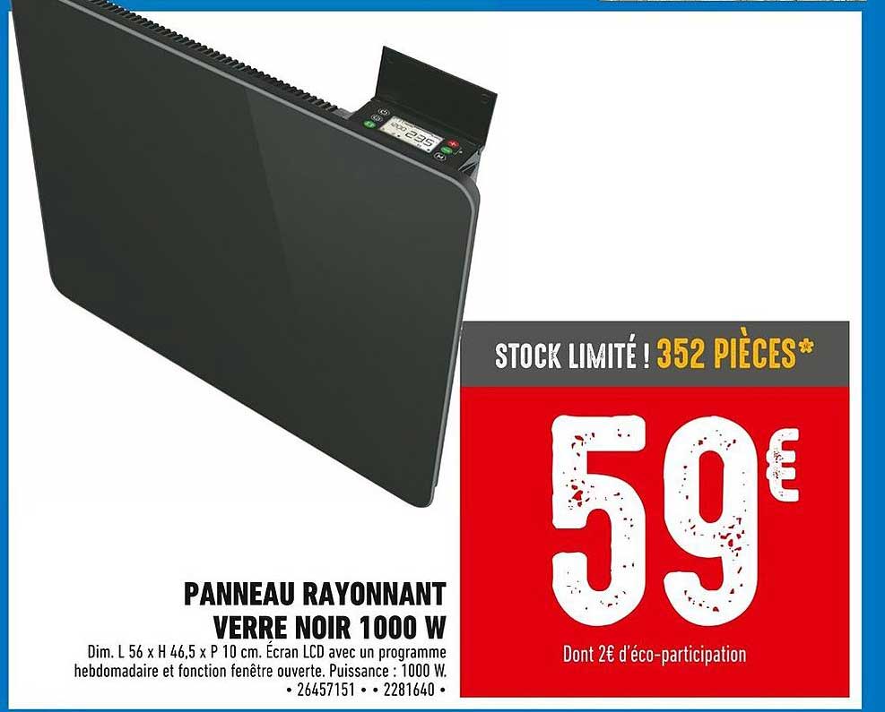 Découvrez dès maintenant la offre PANNEAU RAYONNANT VERRE NOIR 1000 W dans le catalogue de Brico Cash. Cette offre est valable du 03/10/2025 au 16/10/2025.