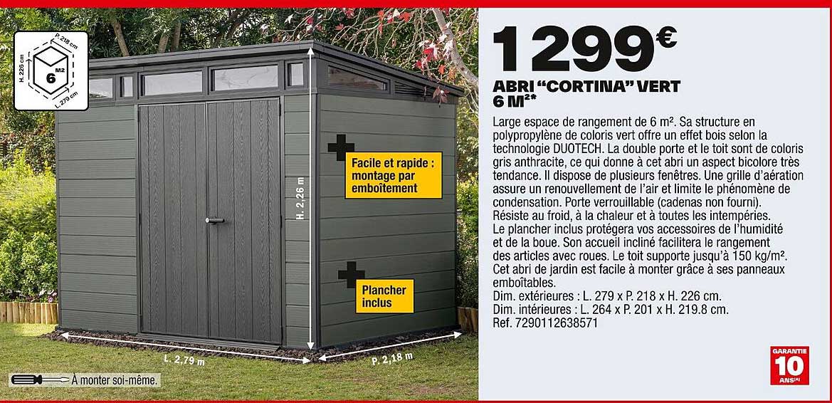 Découvrez dès maintenant la offre ABRI “CORTINA” VERT 6 M²* dans le catalogue de Brico Dépôt. Cette offre est valable du 25/10/2024 au 07/11/2024.