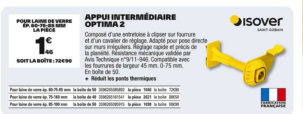 Découvrez l'Appui Intermédiaire Optima 2, un indispensable pour vos travaux d'isolation ! Avec une conception astucieuse, cet accessoire est parfait pour garantir une pose efficace de laine de verre. C'est l'offre qu'il vous faut si vous souhaitez optimiser le confort thermique de votre habitation, tout en réalisant des économies.