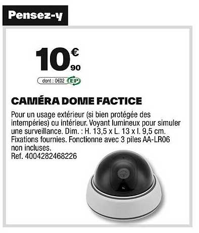 Découvrez l'offre de Caméra Dome Factice chez Brico Dépôt! Cette offre fantastique est maintenant disponible dans le nouveau catalogue de Brico Dépôt. Profitez de cette occasion et économisez considérablement sur votre achat.