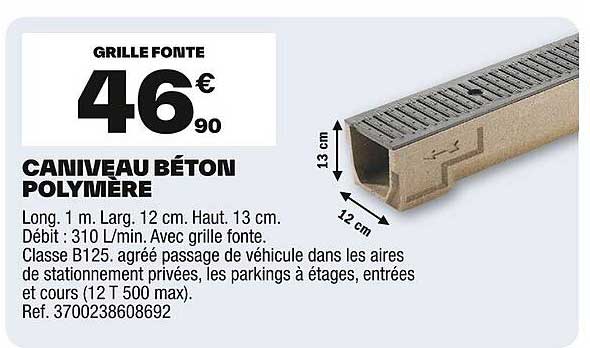Découvrez l'offre de Caniveau Béton Polymère chez Brico Dépôt! Cette offre fantastique est maintenant disponible dans le nouveau catalogue de Brico Dépôt. Profitez de cette occasion et économisez considérablement sur votre achat.