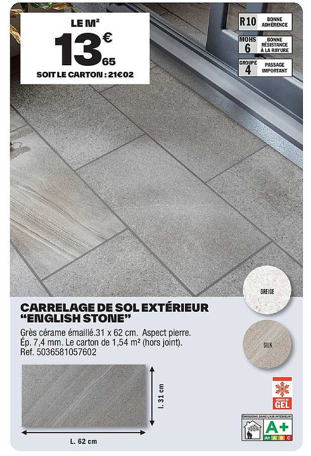 Découvrez dès maintenant la offre CARRELAGE DE SOL EXTÉRIEUR "ENGLISH STONE" dans le catalogue de Brico Dépôt. Cette offre est valable du 28/02/2025 au 13/03/2025.