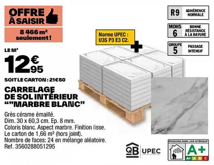 Découvrez la superbe offre de Carrelage De Sol Intérieur “”Marbre Blanc”” dans le nouveau catalogue de Brico Dépôt. En plus de cette offre, vous trouverez de nombreuses autres réductions attrayantes. Vous pouvez facilement commander le Carrelage De Sol Intérieur “”Marbre Blanc”” en ligne via le site web de Brico Dépôt ou l'acheter dans un magasin près de chez vous.