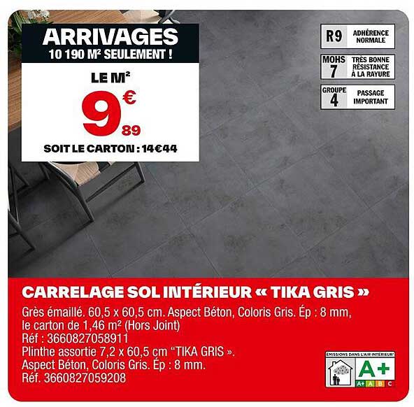 Découvrez le carrelage sol intérieur « TIKA GRIS » proposé par Brico Dépôt ! Avec un prix exceptionnel de 9,89 € le m², c'est l'occasion rêvée de redécorer votre intérieur tout en réalisant des économies. Ce carrelage allie esthétique et fonctionnalité, parfait pour moderniser votre maison avec une touche contemporaine.