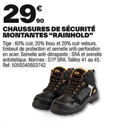 Découvrez les chaussures de sécurité montantes "Rainhold" proposées par Brico Dépôt. Idéales pour les professionnels et les amateurs de bricolage, ces chaussures allient confort et sécurité. Avec un prix attractif, elles représentent une excellente occasion de renouveler votre équipement sans vous ruiner.