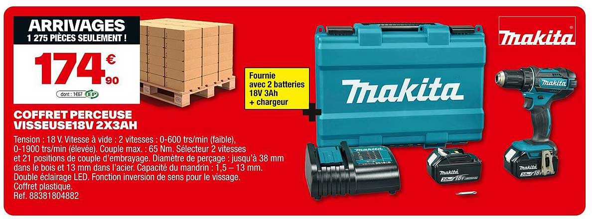 Découvrez le coffret perceuse visseuse 18V 2x3Ah de la marque Makita, une promotion exceptionnelle disponible sur cette page. Avec ce produit, vous bénéficiez d'une performance optimale pour tous vos travaux de bricolage. Que vous soyez un bricoleur aguerri ou un amateur passionné, cette perceuse est un excellent ajout à votre boîte à outils.