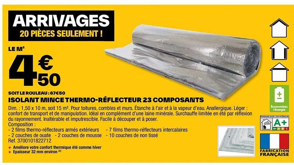 Découvrez dès maintenant la offre ISOLANT MINCE THERMO-RÉFLECTEUR 23 COMPOSANTS dans le catalogue de Brico Dépôt. Cette offre est valable du 27/09/2024 au 10/10/2024.