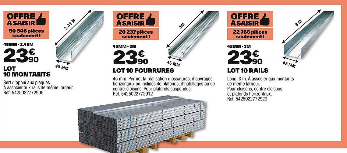 Découvrez la superbe offre de Lot 10 Montants Lot 10 Fourrures Lot 10 Rails dans le nouveau catalogue de Brico Dépôt. En plus de cette offre, vous trouverez de nombreuses autres réductions attrayantes. Vous pouvez facilement commander le Lot 10 Montants Lot 10 Fourrures Lot 10 Rails en ligne via le site web de Brico Dépôt ou l'acheter dans un magasin près de chez vous.