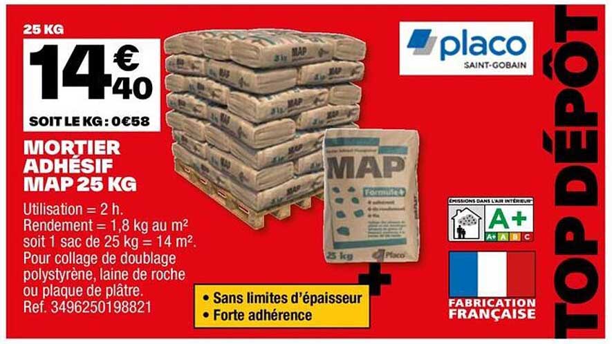Découvrez l'offre de Mortier Adhésif Map 25 Kg chez Brico Dépôt! Cette offre fantastique est maintenant disponible dans le nouveau catalogue de Brico Dépôt. Profitez de cette occasion et économisez considérablement sur votre achat.