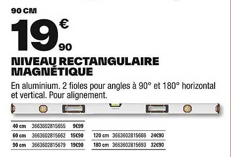 Découvrez dès maintenant la offre NIVEAU RECTANGULAIRE MAGNÉTIQUE dans le catalogue de Brico Dépôt. Cette offre est valable du 04/04/2025 au 15/04/2025.