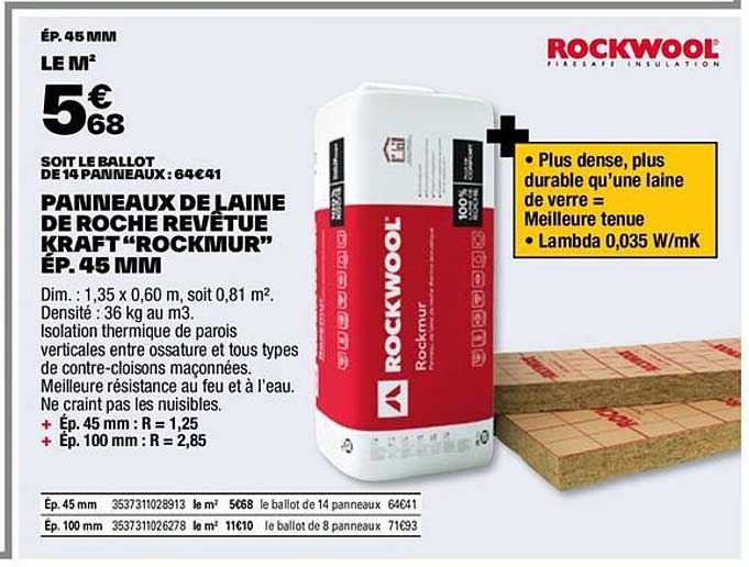 Offre de Panneaux De Laine De Roche Revêtue Kraft “Rockmur” Ép. 45 Mm chez Brico Dépôt