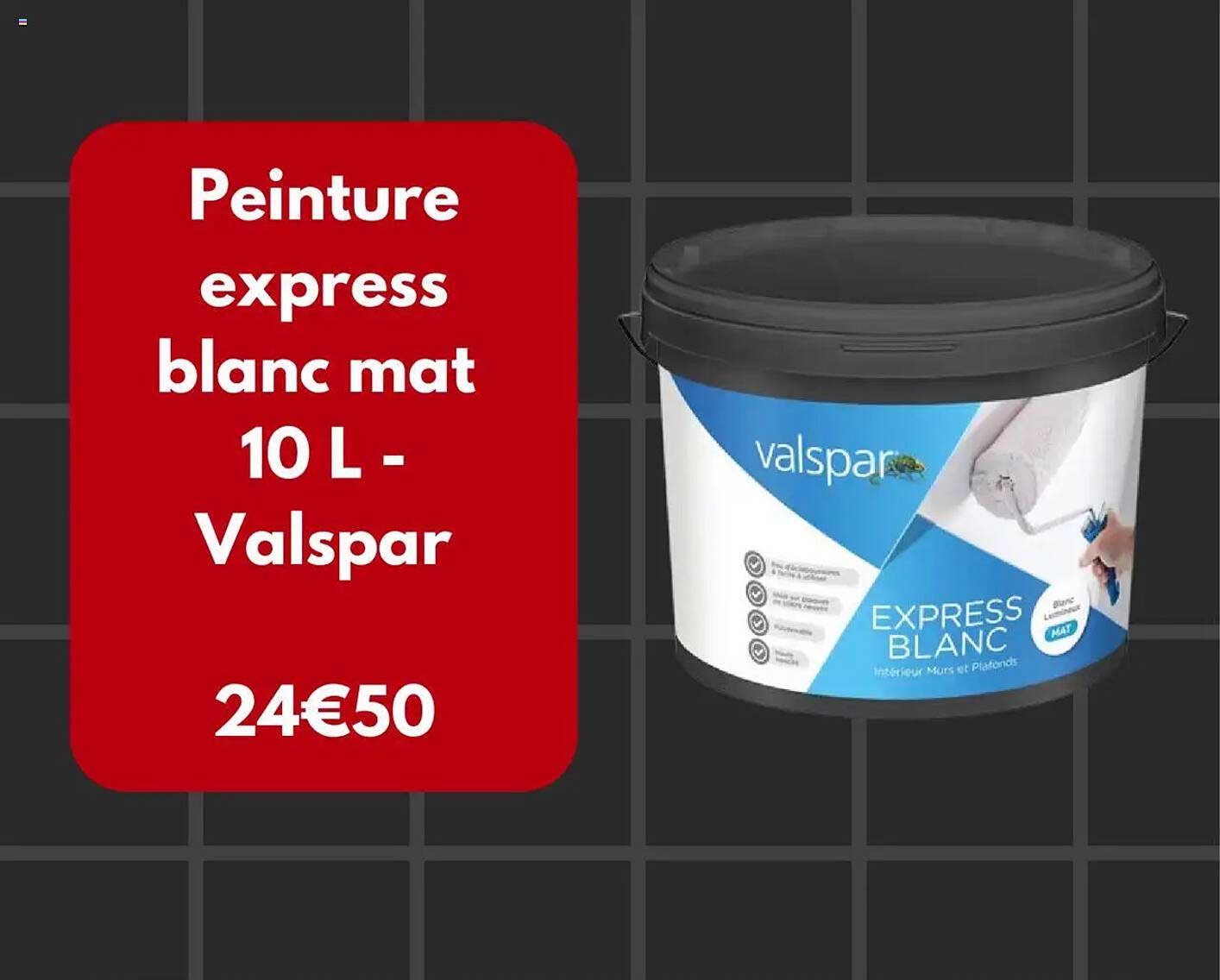 Découvrez dès maintenant la offre Peinture express blanc mat 10 L - Valspar dans le catalogue de Brico Dépôt. Cette offre est valable du 25/11/2024 au 02/12/2024.