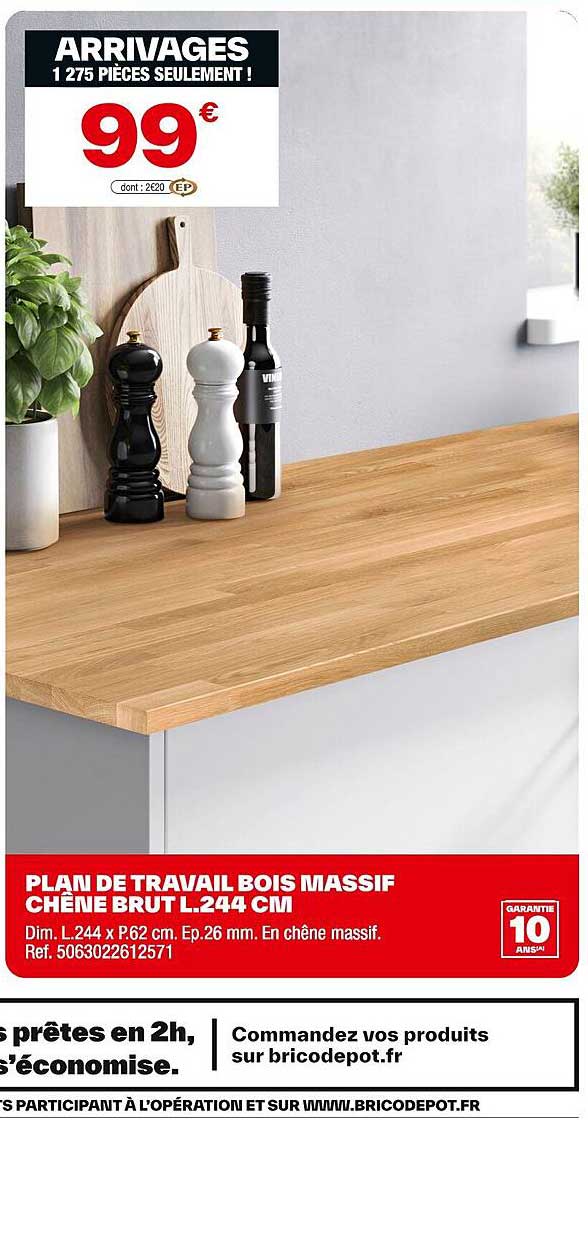 Découvrez dès maintenant la offre PLAN DE TRAVAIL BOIS MASSIF CHÊNE BRUT L.244 CM dans le catalogue de Brico Dépôt. Cette offre est valable du 04/04/2025 au 15/04/2025.