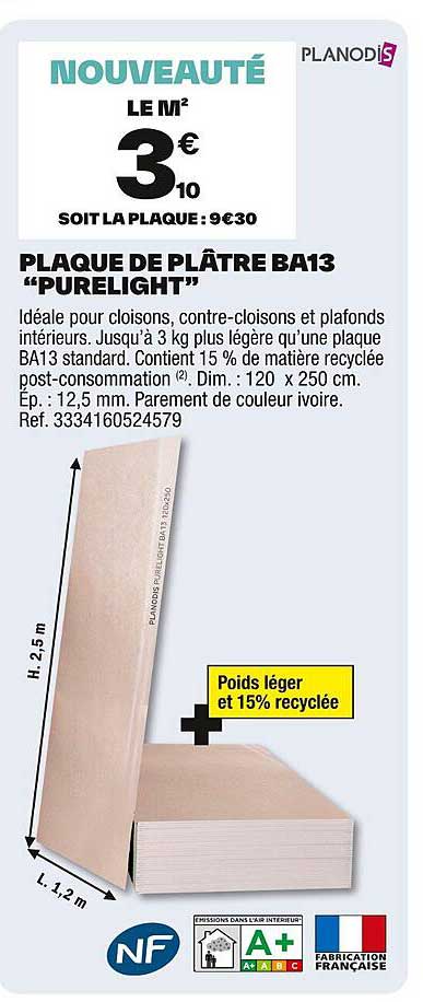 Vous cherchez une solution légère et pratique pour vos projets de bricolage ? La plaque de plâtre BA13 "Purelight" est le choix idéal pour les cloisons, contre-cloisons, et plafonds intérieurs. En plus de sa légèreté, elle contient 15 % de matière recyclée, ce qui en fait un produit respectueux de l'environnement. Disponible à un tarif exceptionnel de 3 € le m², cette offre est à ne pas manquer.