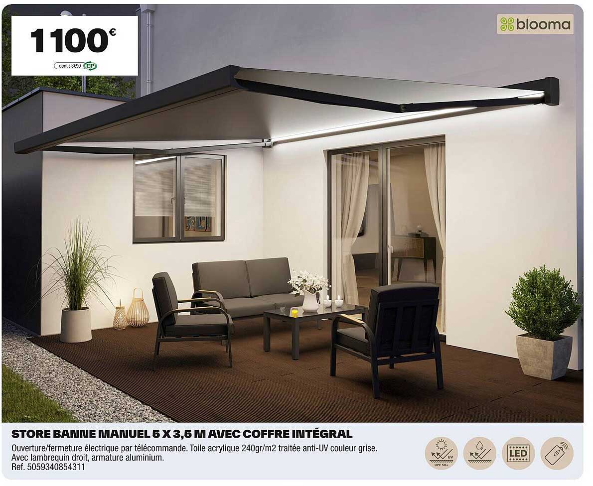Découvrez dès maintenant la offre STORE BANNE MANUEL 5 X 3,5 M AVEC COFFRE INTÉGRAL dans le catalogue de Brico Dépôt. Cette offre est valable du 21/03/2025 au 03/04/2025.