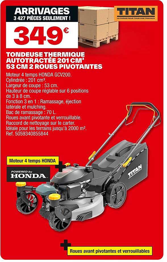Découvrez dès maintenant la offre Tondeuse thermique autotractée 201 cm³ 53 cm 2 roues pivotantes dans le catalogue de Brico Dépôt. Cette offre est valable du 07/03/2025 au 20/03/2025.
