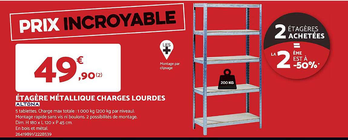Découvrez l'offre de Étagère Métallique Charges Lourdes Altona chez Bricomarché! Cette offre fantastique est maintenant disponible dans le nouveau catalogue de Bricomarché. Profitez de cette occasion et économisez considérablement sur votre achat.