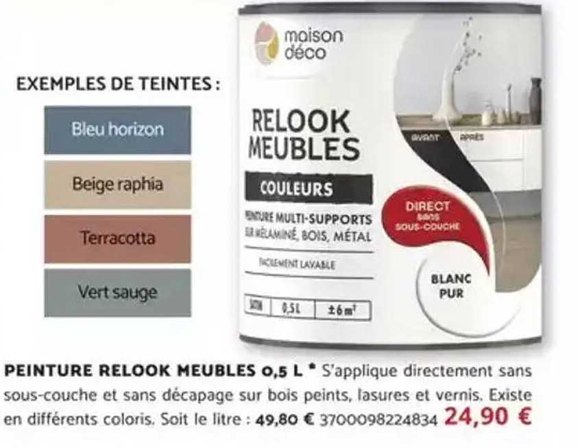 Découvrez l'offre de Peinture Relook Meubles 0,5 L chez Bricomarché! Cette offre fantastique est maintenant disponible dans le nouveau catalogue de Bricomarché. Profitez de cette occasion et économisez considérablement sur votre achat.