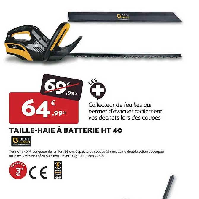Fabriqué par Best Green, ce taille-haie offre un poids léger de seulement 3 kg, ce qui le rend facile à manipuler. Il fonctionne avec une tension de 40 V, ce qui garantit une performance optimale. Il est également équipé de deux vitesses : éco et turbo, adaptés à tous vos besoins de jardinage.