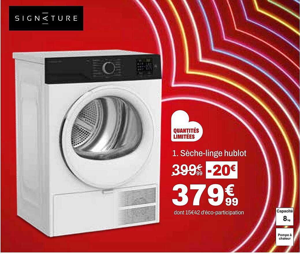 Ne manquez pas cette occasion de vous équiper avec un sèche-linge hublot de la marque Signature. En promotion limitée, cet appareil vous aide à faciliter la tâche du nettoyage et du séchage de votre linge ! Avec une capacité de 8 kg, il est idéal pour les familles ou pour ceux qui ont besoin de sécher régulièrement des vêtements.