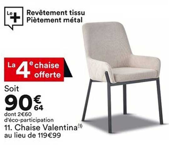 Actuellement, la Chaise Valentina est proposée à 90€64, incluant 2€60 d'éco-participation, une offre franchement attractive par rapport à son prix habituel de 119€99. En plus, pour l'achat de trois chaises, la quatrième est offerte, ce qui représente une économie considérable pour ceux qui souhaitent meubler leur espace avec style.