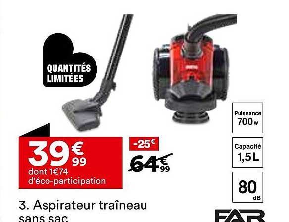 Au prix exceptionnel de 39,99€, dont 1,74€ d’éco-participation, cet aspirateur est proposé avec une remise de 25€, le prix habituel étant de 64,99€. C'est une offre à ne pas rater si vous souhaitez réaliser des économies tout en vous dotant d'un appareil de qualité. Ne tardez pas, car les quantités sont limitées !
