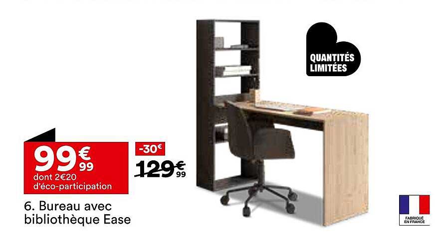 Découvrez dès maintenant la offre Bureau avec bibliothèque Ease dans le catalogue de BUT. Cette offre est valable du 23/09/2025 au 27/09/2025.