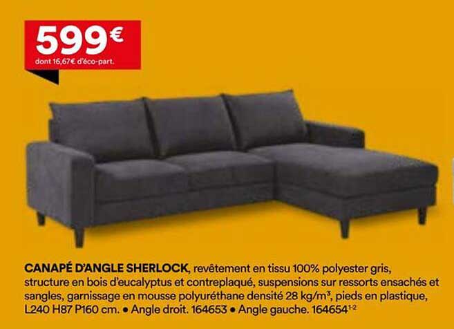 Découvrez le canapé d'angle Sherlock, une pièce maîtresse qui allie confort et style. Avec son revêtement en tissu 100 % polyester gris, ce canapé apportera une touche moderne à votre salon. Profitez de cette offre exceptionnelle valable du 6 au 25 octobre 2025 pour vous offrir ce meuble au rapport qualité-prix imbatable.