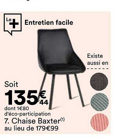 Le prix actuel de la chaise Baxter est de 135,44 € comprenant une participation de 1,80 € à l’éco-participation, au lieu de 179,99 €. Cela représente une économie significative ! Profiter de cette offre, c'est s'assurer d'un excellent rapport qualité-prix.