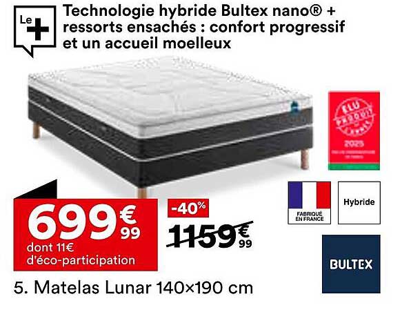 La promotion actuelle vous permet d'acquérir le matelas Lunar au prix de 699,99 €, soit une remise de 40% par rapport au prix habituel de 1159,99 €. N'oubliez pas que ce prix inclut une éco-participation de 11 €, vous permettant ainsi de faire un geste pour l’environnement tout en profitant d’un produit de qualité.