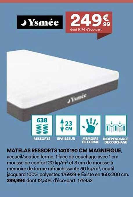 Découvrez le matelas ressorts Ysmèce, conçu pour offrir un confort inégalé et un soutien optimal. Avec ses dimensions de 140x190 cm, ce matelas est idéal pour les couples ou les personnes qui apprécient l’espace pendant leur sommeil. Profitez de cette réduction exceptionnelle sur une qualité qui transformera vos nuits.