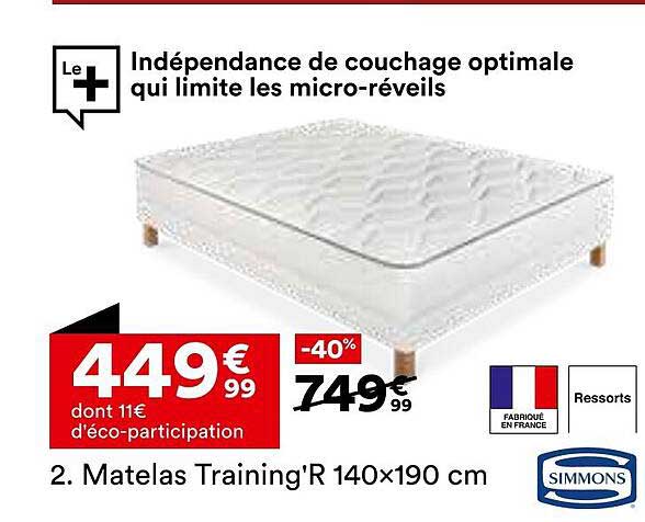 Découvrez le matelas Training'R de Simmons, conçu pour vous offrir une indépendance de couchage optimale et réduire les micro-réveils. Avec cette offre exceptionnelle, vous pourrez bénéficier d'une literie de qualité à un prix avantageux pendant une courte période.