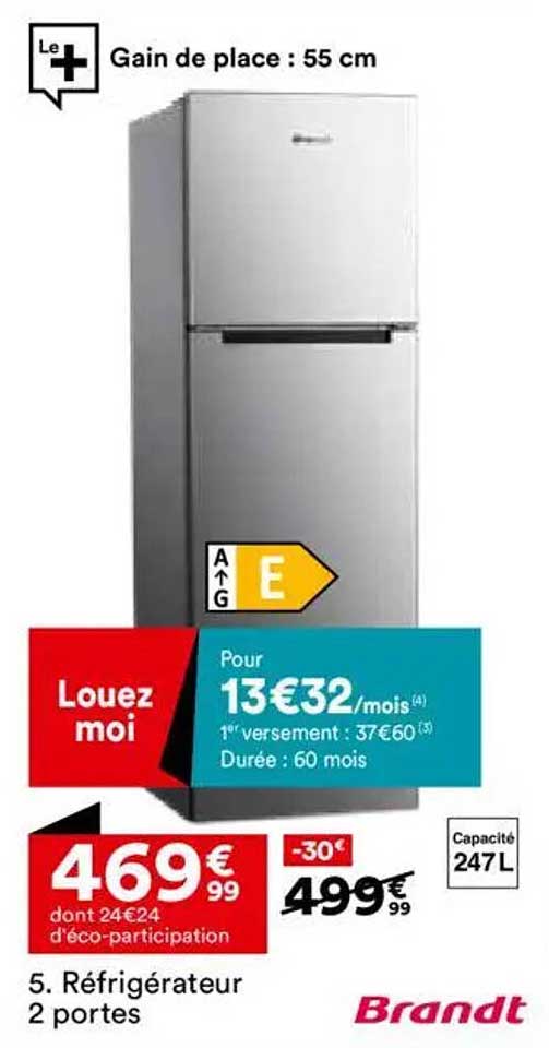 Découvrez ce réfrigérateur 2 portes Brandt, idéal pour les espaces réduits grâce à sa profondeur de 55 cm. Une solution parfaite pour ceux qui cherchent à allier performance et gain de place. Profitez de cette offre exclusive qui saura séduire les amateurs de cuisine et les familles désirant une conservation optimale des aliments.