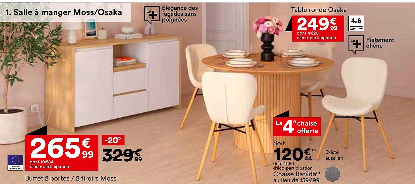 Vous cherchez à donner un coup de frais à votre salle à manger ? Ne manquez pas cette promotion incroyable sur la salle à manger Moss/Osaka de BUT. Avec son design moderne et épuré, cette salle à manger saura séduire tous vos invités. Elle est parfaite pour les repas en famille ou entre amis, tout en ajoutant une touche de sophistication à votre intérieur. Profitez de cette offre limitée pour vous offrir un espace convivial et élégant !