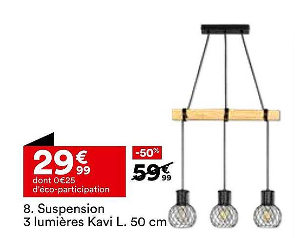 Ne laissez pas passer cette occasion d'embellir votre intérieur avec la suspension 3 lumières Kavi ! Idéale pour apporter une touche moderne et chaleureuse à votre décor, elle est actuellement proposée à un prix défiant toute concurrence. Profitez de cette offre valable du 23 au 27 septembre 2025, et offrez à votre maison un éclairage tendance.